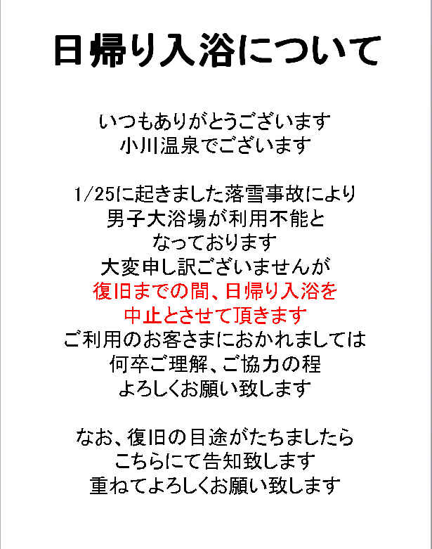 1月の日帰り入浴について